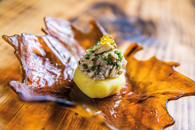 Oblea de harina de maíz con carrillera de ibérico al aroma de trufa y puerro crujiente.