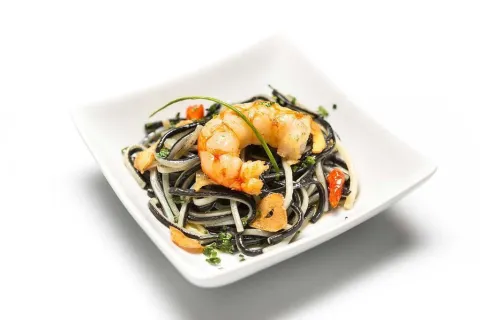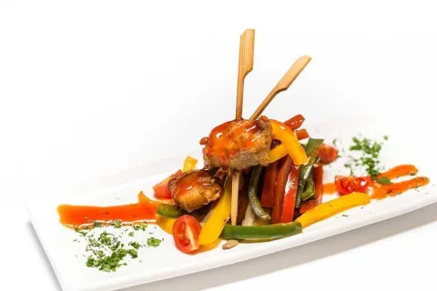 Gambas envueltas con panceta de Rupit acompañadas de pimientos de colores, setas y salsa agridulce picante.