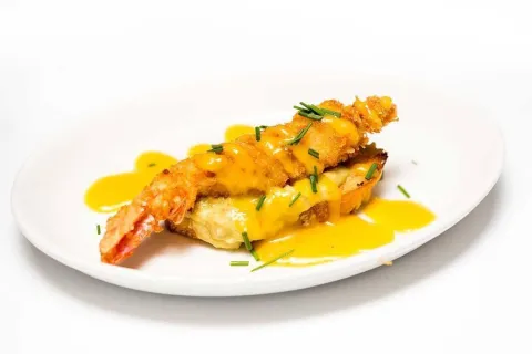 Mar y montaña de cordero, cocido a baja temperatura durante 12 horas, con su salsa y gamba langostinera a la plancha.