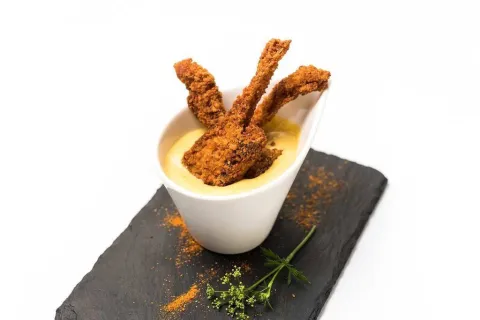 Brocheta de pechuga de pollo empanado con sésamo sobre un fondo de puré de calabaza.