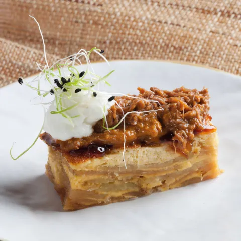 Carrilleras de ternera guisadas sobre patatas gratinadas con cebolla caramelizada y espuma de queso de cabra.
