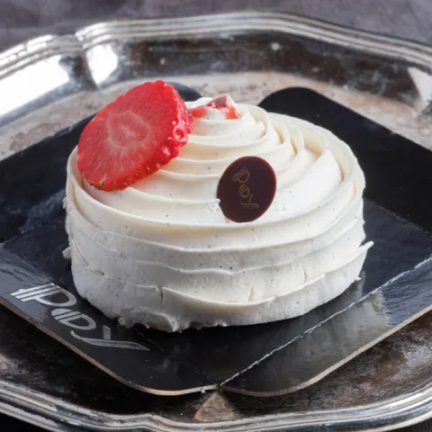 Base de mousse de fresa con crema namelaka y cobertura blanca de chocolate Opalys con vainilla.Un dulce homenaje a la Rosa de Reus, símbolo de la ciudad. Este postre es una caricia para los sentidos: la suavidad de la mousse, el aroma de la fresa y el toque seductor del chocolate blanco se fusionan en una experiencia delicada e inolvidable.