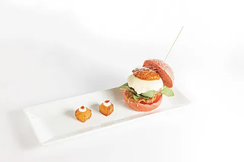 Brava liquida 9burg y canelón crujiente de rostit con crema de gorgonzola