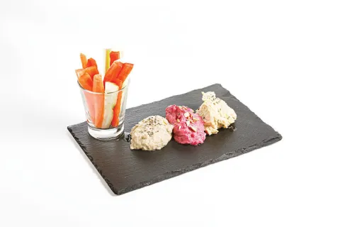 Hummus de garbanzos, hummus de remolacha y baba ganoush (paté de berenjena) con tostaditas.
