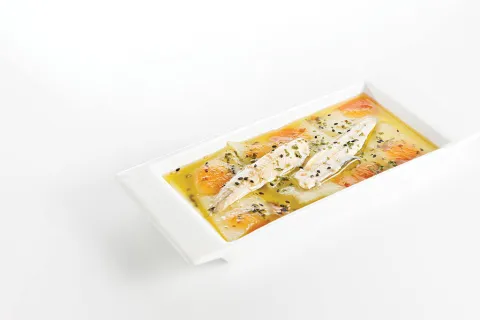 Carpaccio de melón con boquerón en vinagre, aceite de ajo y perejil y mermelada de tomate.