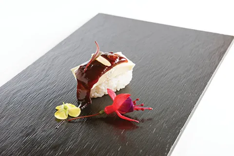 Batido de foie fresco de pato, toffee cremoso de baobab, tamarindo y yuca lacada con miel y whisky.