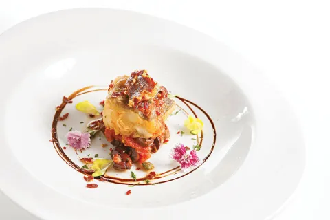 Bacalao a la andaluza, con tartar de tomate, aceitunas de Kalamata, alcaparras y crujiente de ibérico.