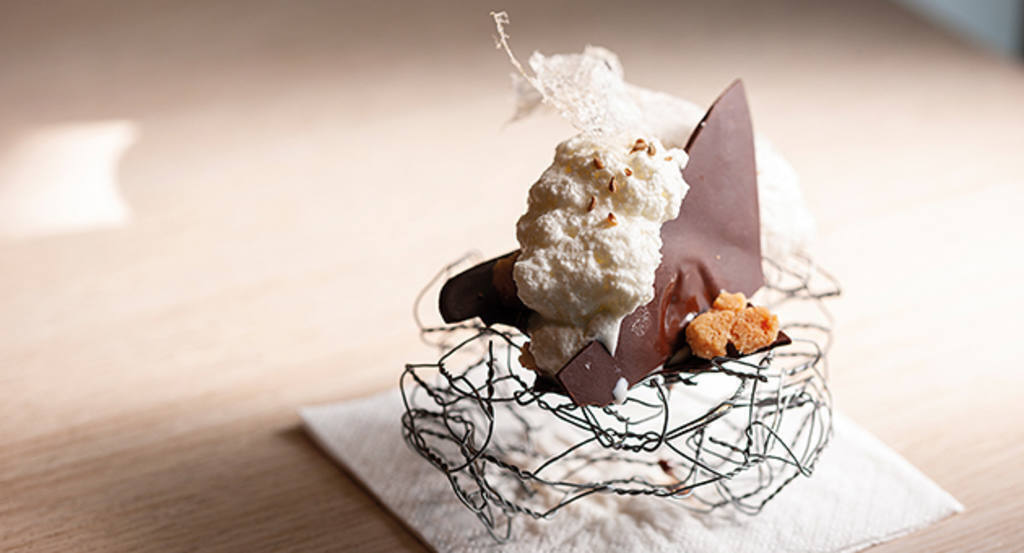 Por su parte, Bubbles Gastrobar propone un elixir de aceite de oliva virgen extra, cremoso de manzana y ratafía, queso de oveja, crumble de mantequilla noisette, chocolate sazonado y anís.