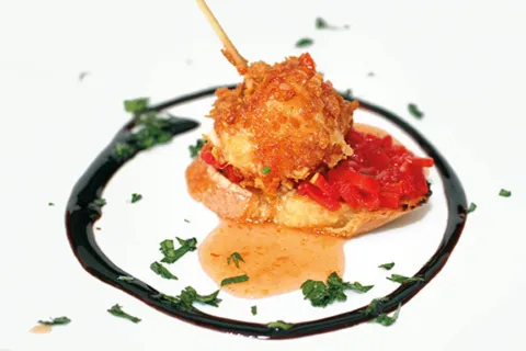 Historias mínimas es el nombre del pintxo de Bar Gautxo: bola de queso Gruyere con cereales, piperrada y tostada de ajo.