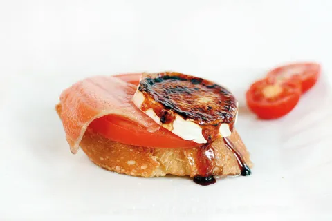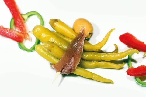 En La Piazzetta de Gros han preparado para esta cita su versión particular de Ocho apellidos vascos, un pintxo que consta de una rodaja de pan tostado con puré de sidra, una rodaja de tomate fresco a la plancha, una lámina de queso de Idiazábal, txapela de txampis a la plancha, pimiento verde frito, guindilla a la plancha y nuez troceada.
