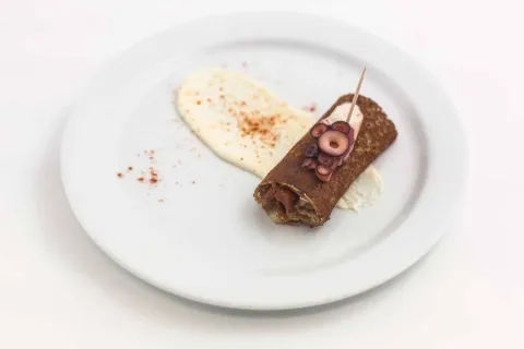 Otro tataki imprescindible es el de Llop de Mar, a base de atún rojo con lechuga de mar, arroz negro y huevos de trucha.