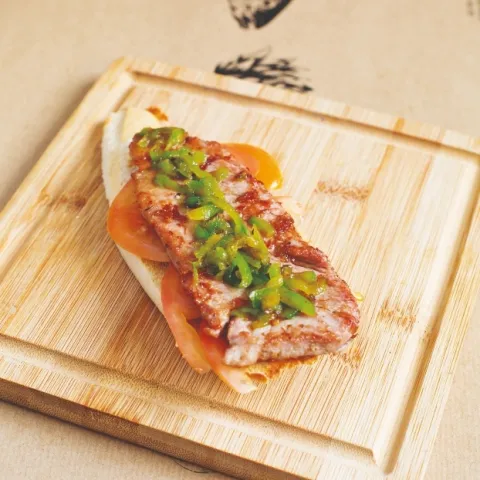Pan bao con carne de chato murciano, chalota, rúcula, crema de cheddar y salsa teriyaki.