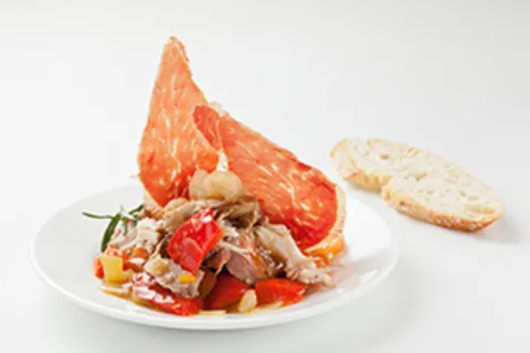 Tostada de pan, lagarto de cerdo ibérico marinado, pimiento escalivado y cebolla confitada con alioli suave.