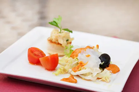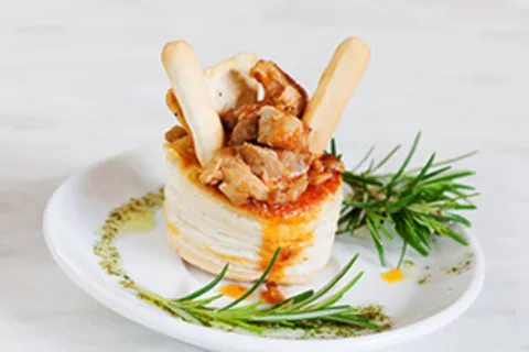 Timbal crujiente de patatas, calabacín, mejilla de cerdo ibérico a baja temperatura, tomates encurtidos y queso de cabra gratinado, con un toque de miel de caña.