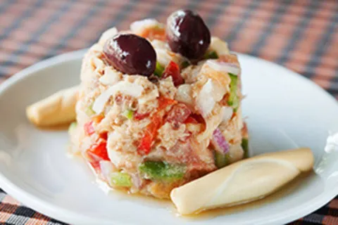 Nuestra ensaladilla rusa con patata, huevo, atún, aceituna, zanahoria y mayonesa con picos de pan y crujiente de patata chip.