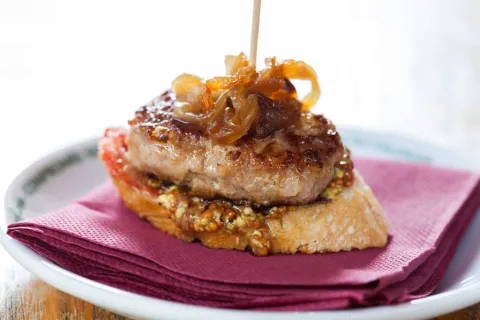 Tostada de pan, lagarto de cerdo ibérico marinado, pimiento escalivado y cebolla confitada con alioli suave.