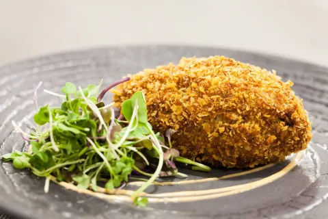 "Canasta" de empanada rellena de pollo asado con verduras, especias, hierbas aromáticas y curry.