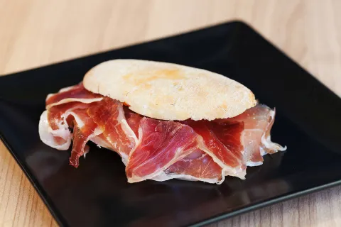 Pan típico del sur con un exquisito sabor y jamón Gran Reserva cortado a mano.