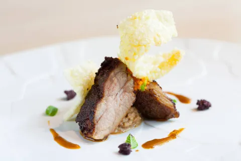 Pieza de cordero cocinada a baja temperatura, hummus de lentejas, cuscús hinchado y vadouvan de especias.