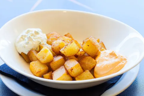 Patatas ecológicas con cuatro salsas caseras: brava, queso, atún y la especial de la casa.