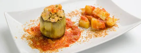 Ou Pota Blava a la flamenca amb cruixent de pernil ibèrico, del Centro Extremeño Ruta de la Plata.