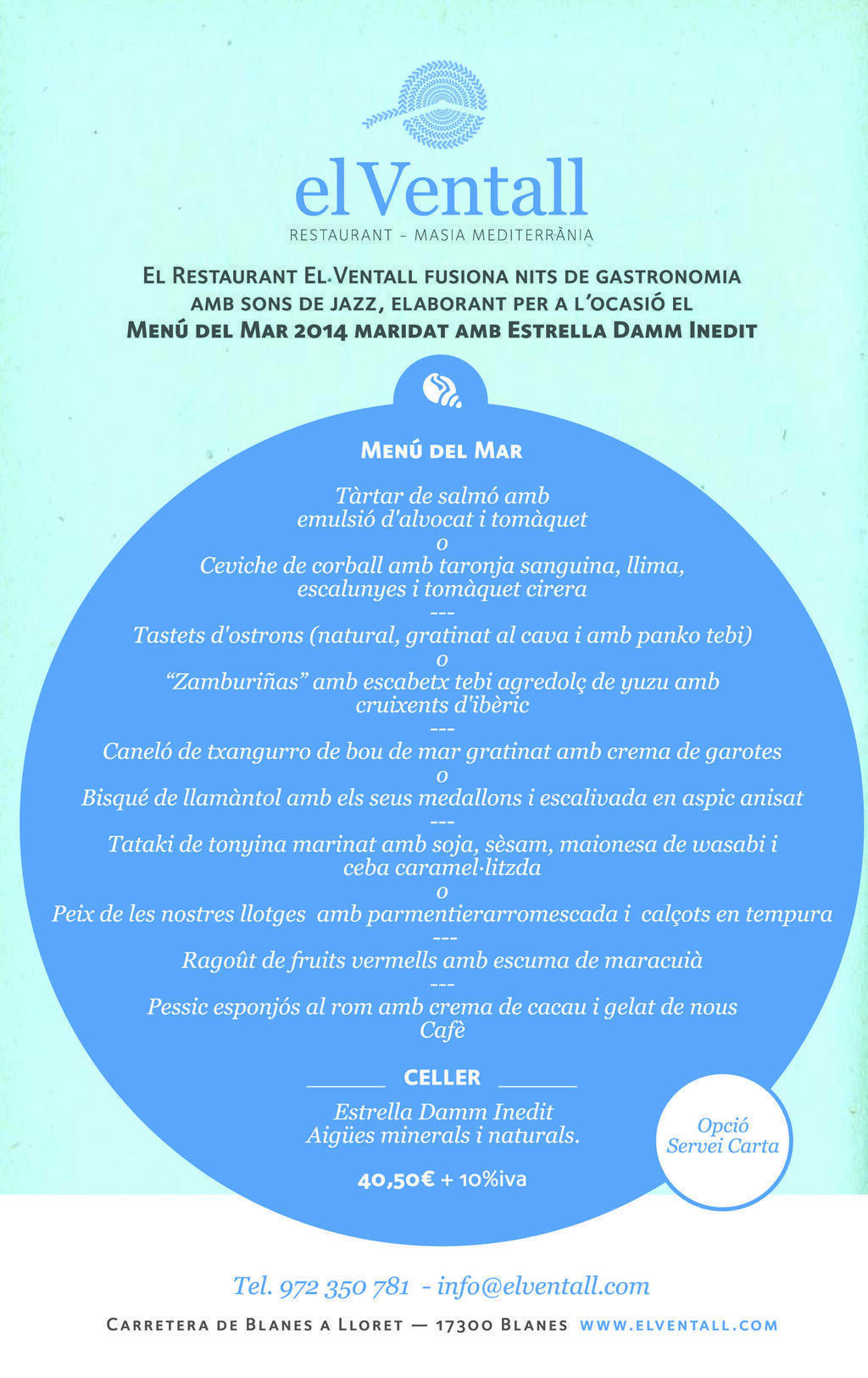 Els fruits del mar són el teu punt dèbil? Entre carn i peix, sempre tries la segona opció? Llavors, la proposta gastronòmica que ha preparat El Ventall està pensada especialment per a tu. Totes les nits dels dissabtes a partir del 8 de febrer i fins al 29 de març aquest restaurant situat en una masia amb molt encant organitza el Menú del Mar 2014. Es tracta d’uns sopars molt especials que combinen un menú degustació basat en peix i marisc i, a més, amenitzat amb música de jazz en directe.