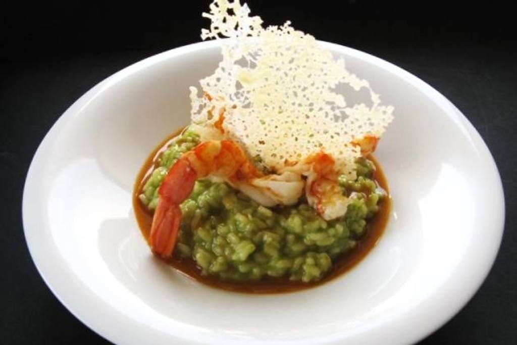Ingredients per a l'arròs: 350 g d'arròs, 12 gambes vermelles, 1,5 l de brou blanc d'au i verdures, mig got de vi blanc i formatge parmesà ratllat.