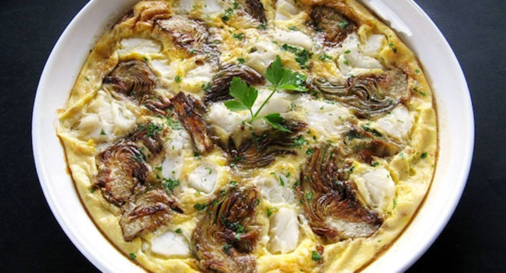 A la mateixa paella, si pot anar al forn, o en una safata que ofereixi la mateixa possibilitat, prèviament untada amb oli, hi aboquem els ous deixatats i amb el punt de sal que creguem necessari segons ens hagi quedat de salat el bacallà (sempre cal provar-lo en cru per trobar aquest punt de sal). Hi posem a sobre les carxofes i el bacallà cru, pebrem al gust, hi afegim algunes herbes picades (julivert o una punta de farigola) i ho entrem al forn fins que l'ou està quallat al nostre gust.