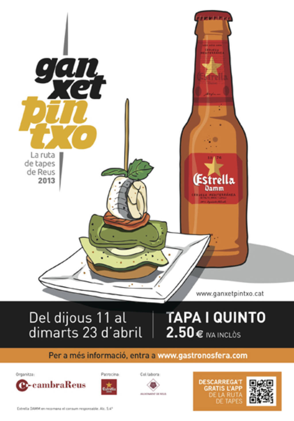 Amb la primavera arriba una de les rutes gastronòmiques més esperades, sobretot pels habitants de Reus i voltants. Estem parlant de la Ganxet Pintxo, la ruta de tapes de Reus, que aquest 11 d'abril inaugura el seu 4a edició precedida d'uns números espectaculars que es proposen batre. I és que a la Challenge de 2012 es van arribar a consumir més de 200.000 tapes.