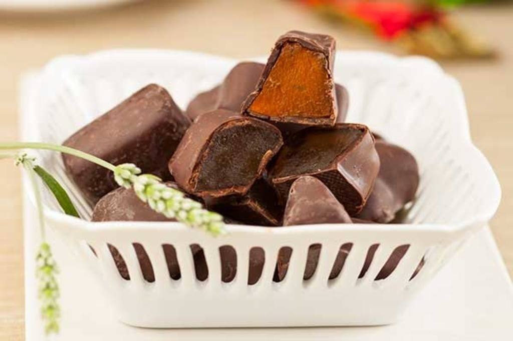 Fonem la xocolata al microones o al bany maria i hi submergim les fruites, totes o una part (per exemple, la meitat del tall de taronja o de poma).