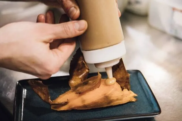 - Al momento de servir pondremos de base el boniato e iremos cubriendo con un punto de salsa.