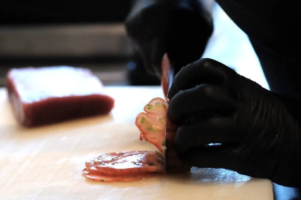 -Preparamos el atún que tendremos previamente congelado y lo partiremos en finos trozos.