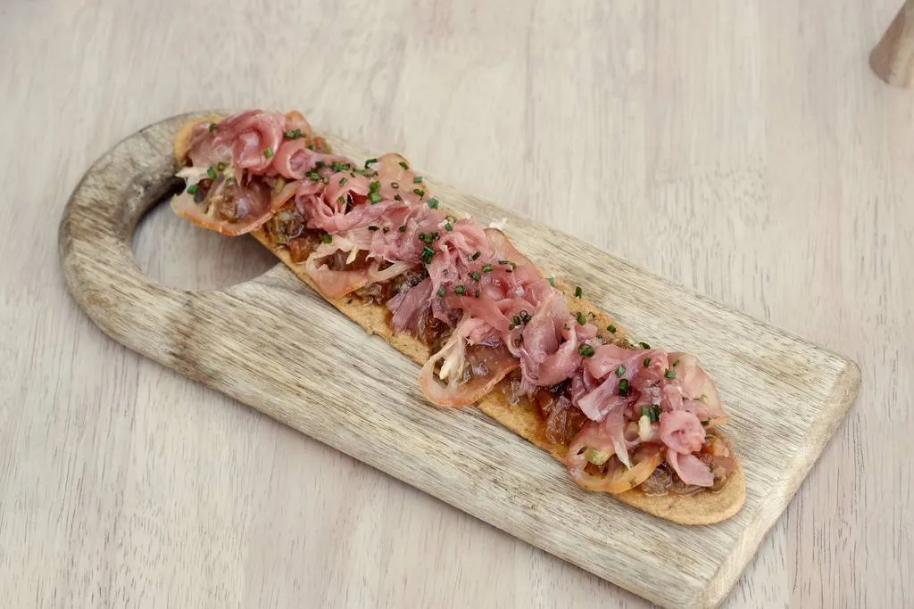 Sorprende encontrarse con elaboraciones tan simples pero tan completas al paladar. Es el caso de la coca con atún rojo Balfegó, de la carta del Bar del Pòsit de Cambrils. El toque caramelizado y tierno del atún –adornado en forma de montaña– contrasta con la coca que unifica, en la base, un delicioso sofrito de verduras coronado por cebollinos colocados en forma de flor.