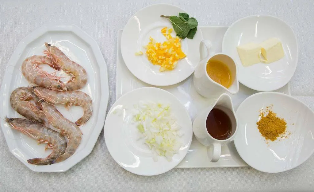 Pasamos a emplatar distribuyendo los langostinos en el plato y esparciendo, por encima de los mismos, la crema de naranja.