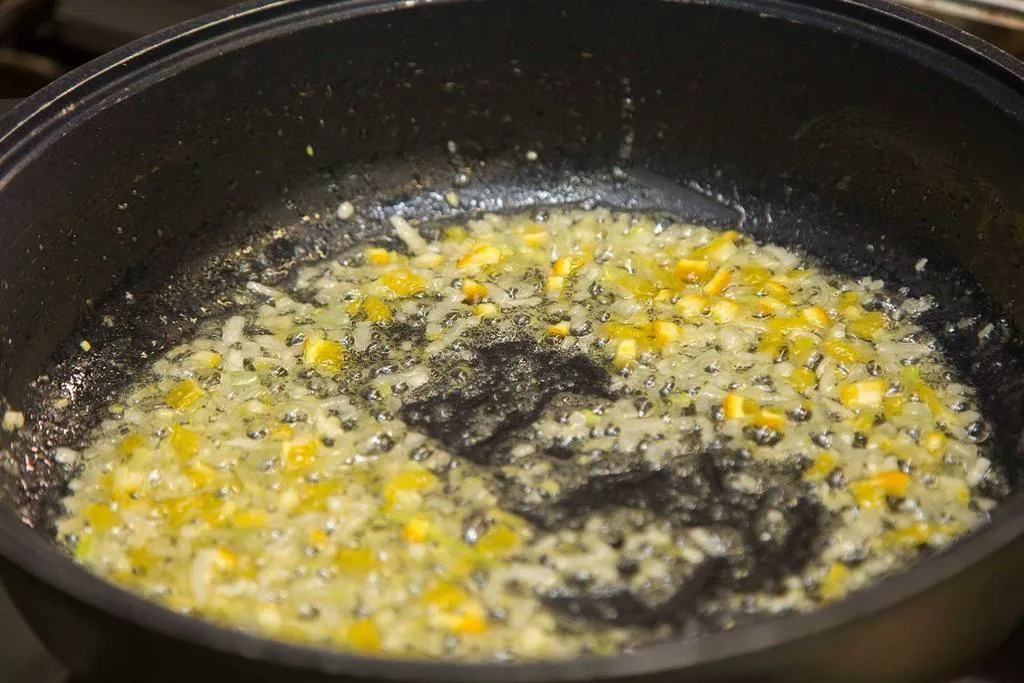 Cortamos la cebolla de Figueres en brunoise y la ponemos a pochar en la misma sartén en la que hemos marcado los langostinos.