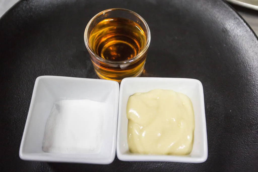 Para la guarnición, pelar las manzanas y colocar en una bandeja para el horno junto con el vino blanco, el vino rancio, la mantequilla y el coñac. A 180 grados durante 25 minutos.