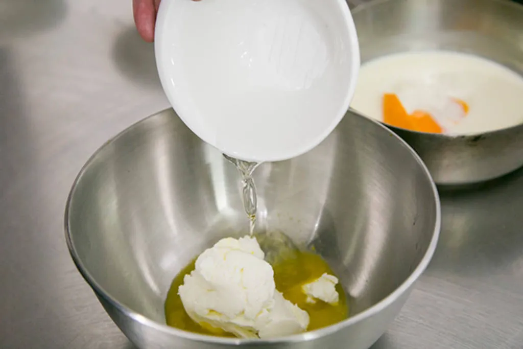 - Cogemos otro bol y añadimos el queso Philadelphia, el zumo de mandarina y el licor. Incorporamos, con un colador, la mezcla caliente de nata, piel de mandarina, azúcar y gelatina. Con esto obtendremos una masa que dejaremos reposar, como mínimo, 12 horas en el congelador (lo ideal son 24 horas), tapada con un film.