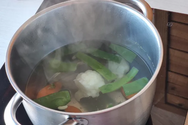 - Cocer la coliflor, las judías verdes, el brócoli y la zanahoria hasta que estén en su punto. También pueden hacerse al vapor. Saltear los champiñones con los espárragos trigueros y un poco de aceite hasta que estén tiernos.