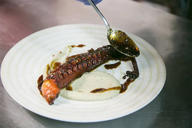 Para emplatar, extendemos por el plato un poco de parmentier de berenjena, colocamos la pata de pulpo encima y la cubrimos con salsa yakiniku.