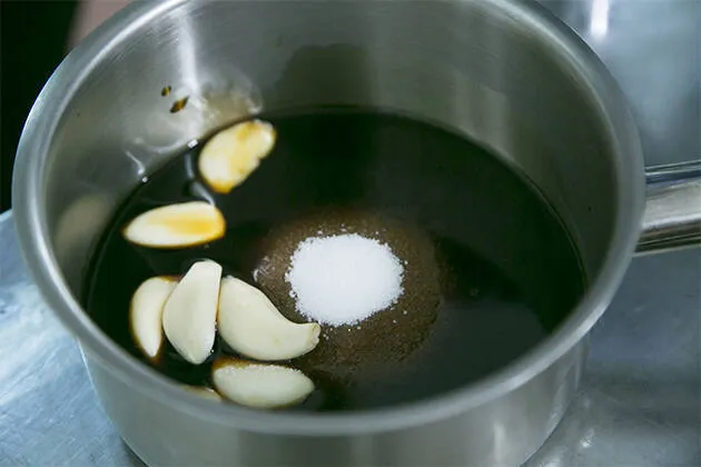 Para preparar la salsa japonesa yakiniku, de sabor agridulce, ponemos a hervir en un cazo la salsa de soja, la guindilla, el azúcar y los ajos.