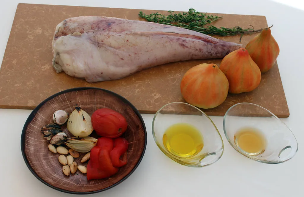 Rape asado con juego de verduras, salsa romescu y gelatina de tomate valenciano