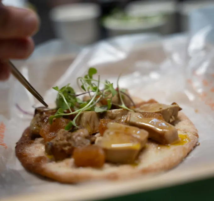 Membrillo e Idiazábal, ese postre tan típico de las sobremesas vascas, se combina con ingredientes menos comunes como la lima y la remolacha en este pintxo de Jose Mari Taberna, local ubicado en la parte vieja de Donostia. Elegante y moderna, esta tarta de foie evoca recuerdos arraigados en la zona, gracias a las crujientes tortas de anís que nos conectan con las amamas del norte.