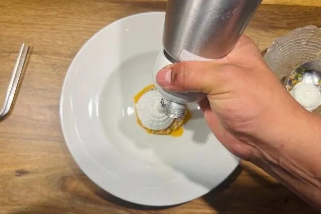- Desmigar el queso de cabra. Juntarlo en un recipiente con el queso filadelfia, nata, y leche. Mezclarlo bien con una batidora de mano. Cargar un sifón y añadir la mezcla.