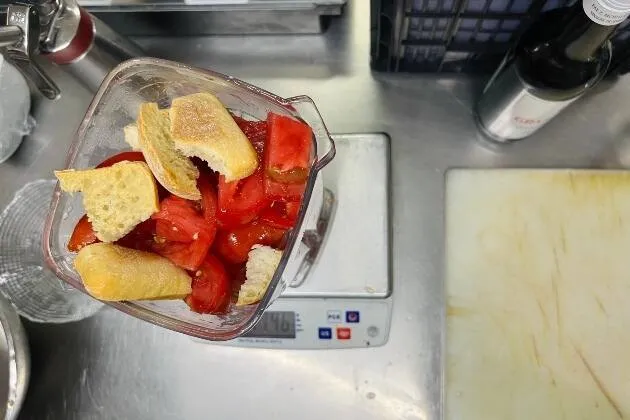- Quitar el centro de los tomates y cortar en trozos grandes. Romper el bollo de pan en trozos y añadirlo junto con el tomate a una licuadora. Añadir el ajo, cebolleta y pimiento y dejar licuar durante un par de minutos.
