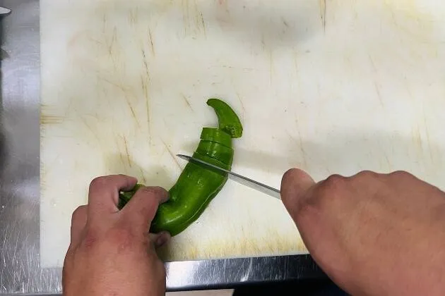 - Calentar una sartén en fuego alto con un poco de aceite. Añadir la gamba picada y saltear hasta que se haga. Mezclar en un bol con una cucharadita de jengibre encurtido picado, cebollino picado y un chorrito de vinagre balsámico blanco y aceite suave.