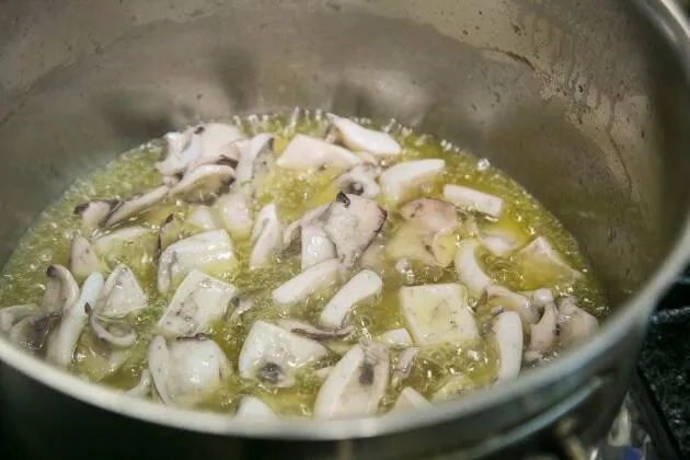 - Ponemos a calentar aceite de oliva en un cazo a fuego alto. Cuando el aceite esté un poco caliente, añadimos la sepia troceada.