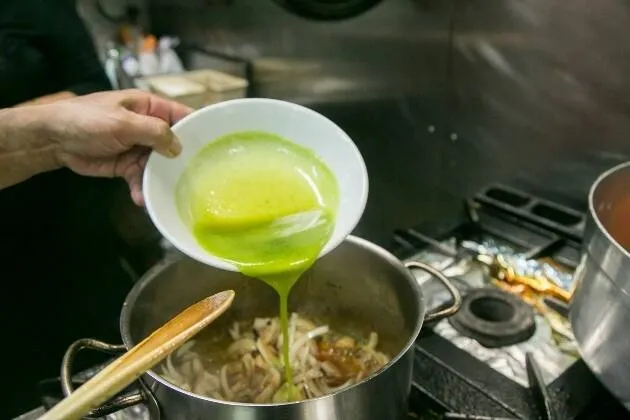 - Bajamos el fuego y le vamos dando vueltas durante cuatro o cinco minutos. Después, añadimos una copa de vino blanco, removemos e incorporamos la cebolla troceada en juliana y el tomate triturado concentrado. Incorporamos la picada de ajo, perejil, pan frito y almendras y salpimentamos al gusto.