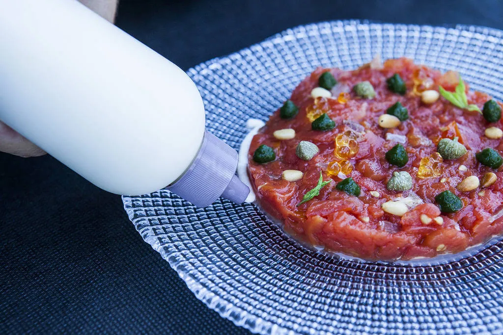 - Con la ayuda de un biberón, decorar con unos puntos de gel de albahaca sobre el tartar y, una vez retirado el molde, rodear el tartar con unos puntos de suero de Idiazabal.
