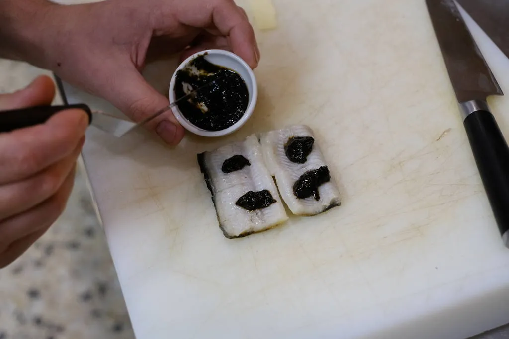 Según las personas a las que sirvamos, trocearemos un número de trozos de pan integral determinado. Encima de cada uno de ellos, colocaremos un trozo de ‘xapadillo’ de anguilla, mermelada de alga nori y, jengibre encima, para darle un gusto singular.