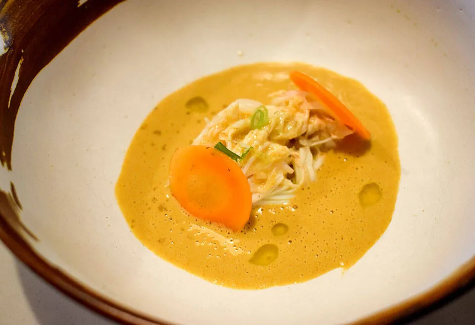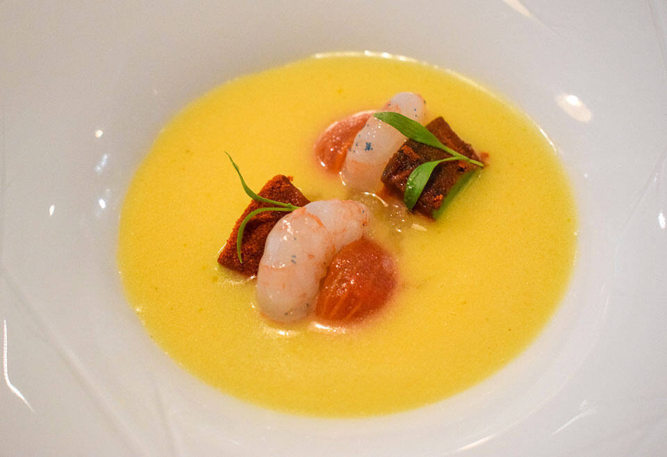 Uno de sus entrantes más frescos es el gazpacho amarillo con quisquillas y aguacate, un plato con un punto ácido y un toque picante que enlaza muy bien al dulzor de la quisquilla. También muy ligera la centolla de Marbella al Jerez, mezclada con un jugo aromatizado con Jerez y con una base de hummus de zanahoria. Ambos platos son la entrada del menú Gran Back. El tercer pase son los aperitivos, una bandeja de bocados ‘finger food’ original y con sabores muy diferentes que comienza con un gazpacho con granizado de lima y continúa con un bocado al que llaman ‘chiclefoie’. Se trata de una pieza en la que se aprecia un escabeche, foie, mochi (para esa textura chiclosa) y pistachos caramelizados. Después es el turno de una corteza con chicharrón de Cádiz, especiada y picante, y por último, una croqueta de carabinero acompañada de su cabeza. Algunos de estos bocados tan divertidos que están a mitad de camino del menú se pueden pedir también a la carta.